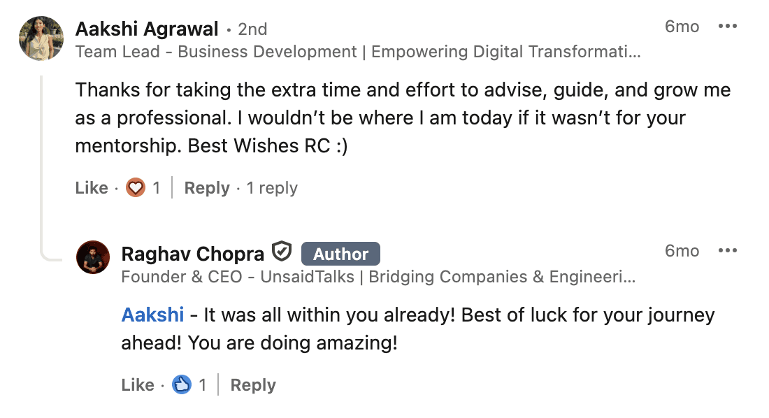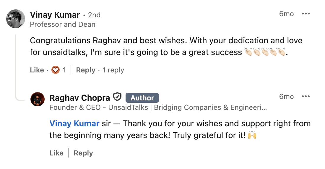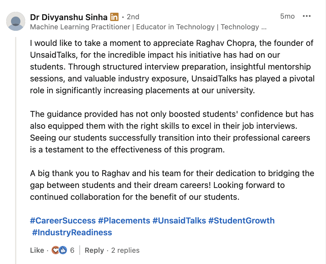 Over the years, I’ve had the privilege of: Working as a Business Analyst role in a big MNC. Later Building my skills as a Software Developer crafting solutions line by line. Further working as BDM to work on sales and marketing. And finally, taking the leap to become the Founder of UnsaidTalks one of India’s fastest-growing mentorship communities for engineering students.